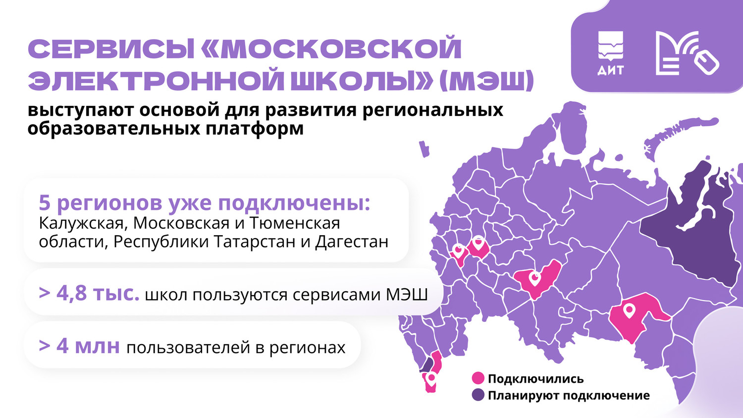 Подсистемы и сервисы МЭШ стали основой для региональных цифровых образовательных платформ. Сегодня они уже работают в Калужской, Московской, Тюменской областях, Республиках Татарстан и Дагестан — в общей сложности это 4 млн педагогов, школьников и их родителей.