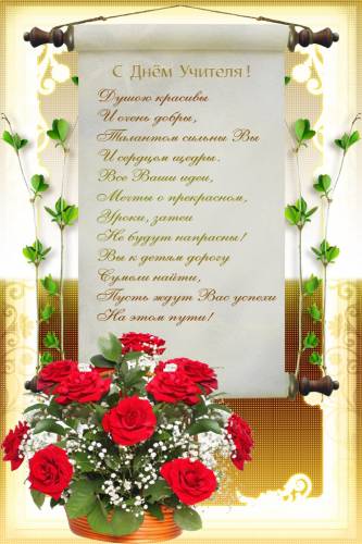 Какое гордое призванье - Давать другим образование, - Частицу сердца отдавать Пустые ссоры забывать, Ведь с нами объясняться трудно, Порою очень даже нудно Одно и то же повторять, Тетради ночью проверять. Спасибо вам за то, что вы Всегда бывали так правы. Хотим мы пожелать, Чтоб вы не знали бед, Здоровья, счастья на сто лет!