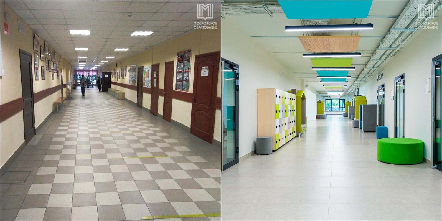 Уже несколько лет в Москве реконструируют школы, которые морально и физически устарели. При обновлении первых 55 корпусов использовали один дизайн с бирюзово–салатовыми акцентами. Сейчас же на выбор школы есть еще два цветовых решения — с оранжево–зелеными или желто–зелеными акцентами.